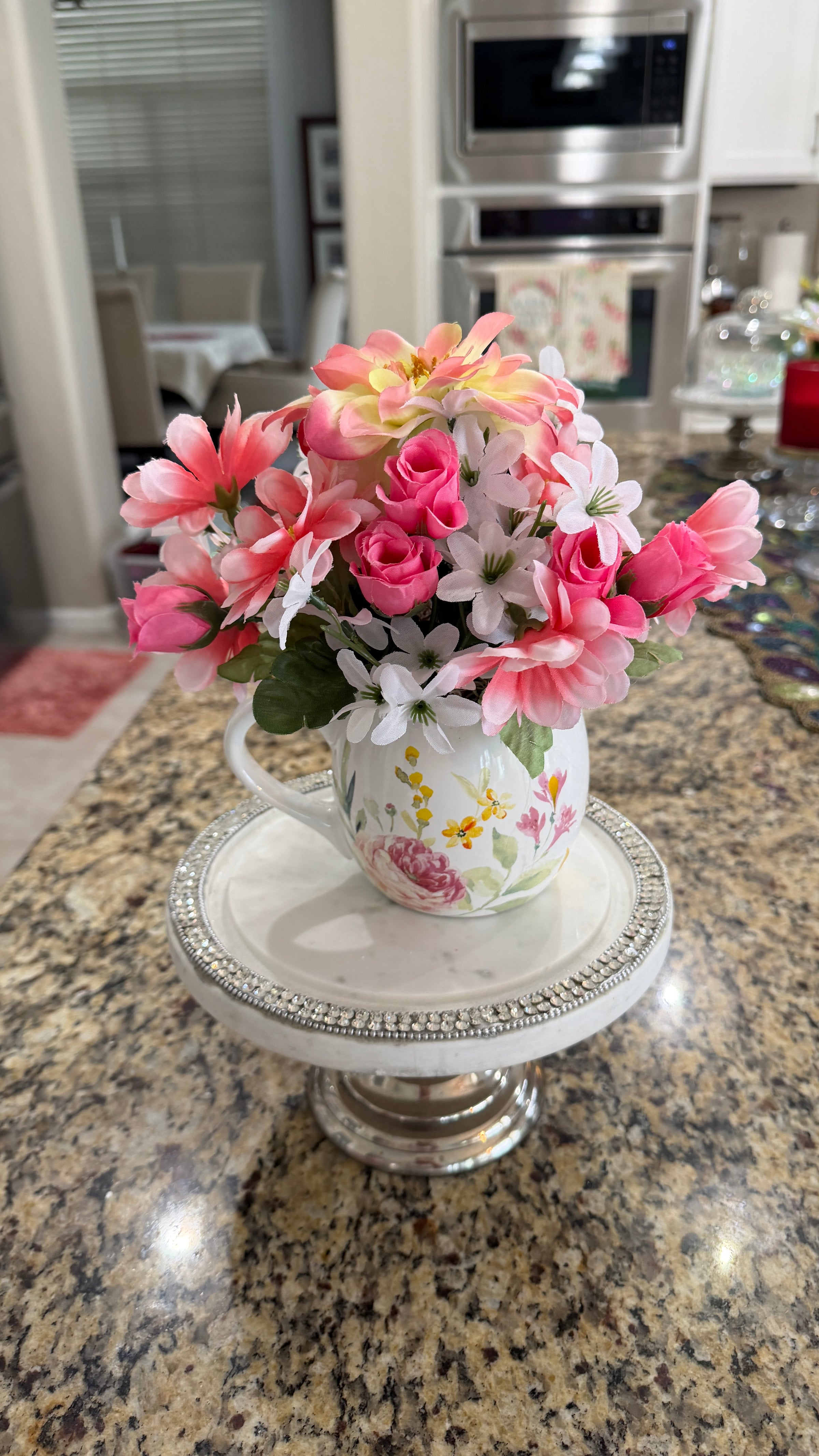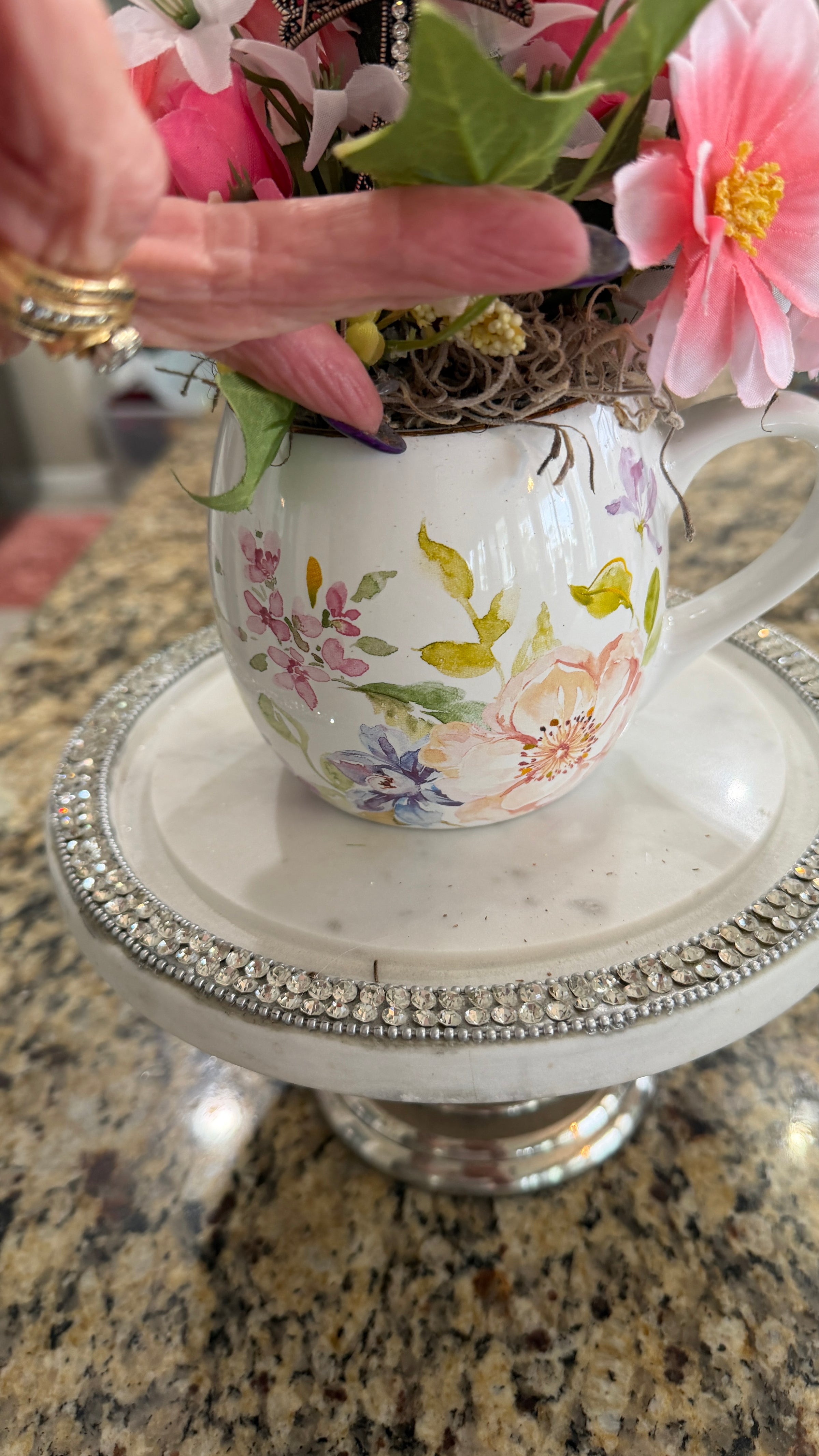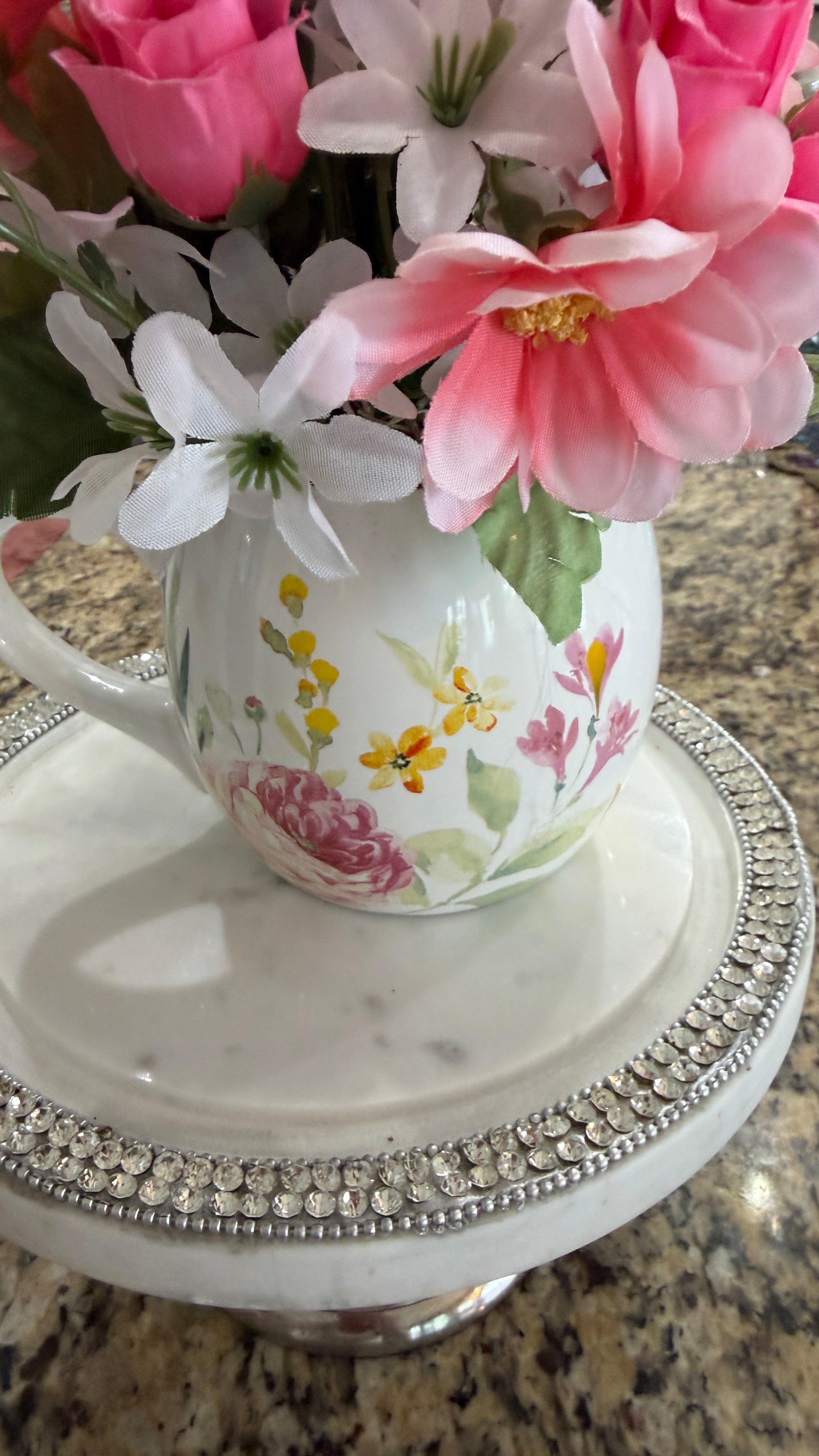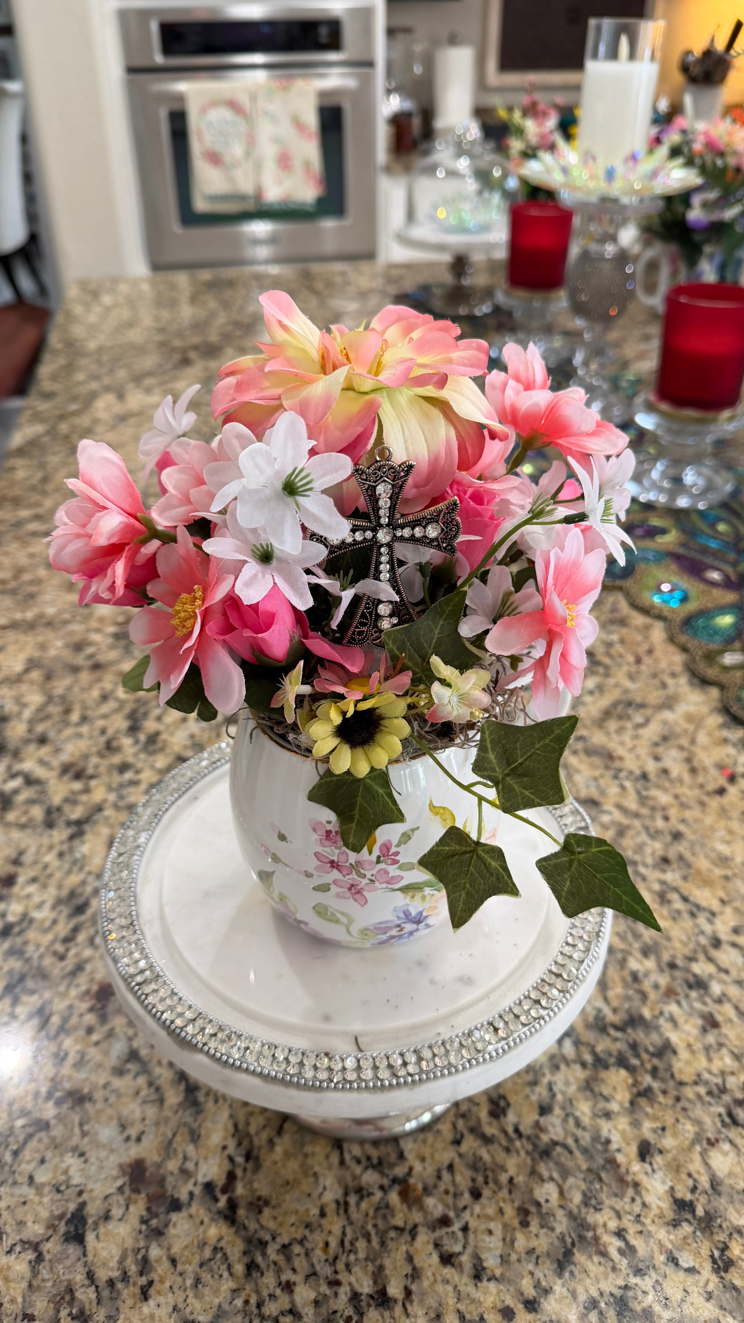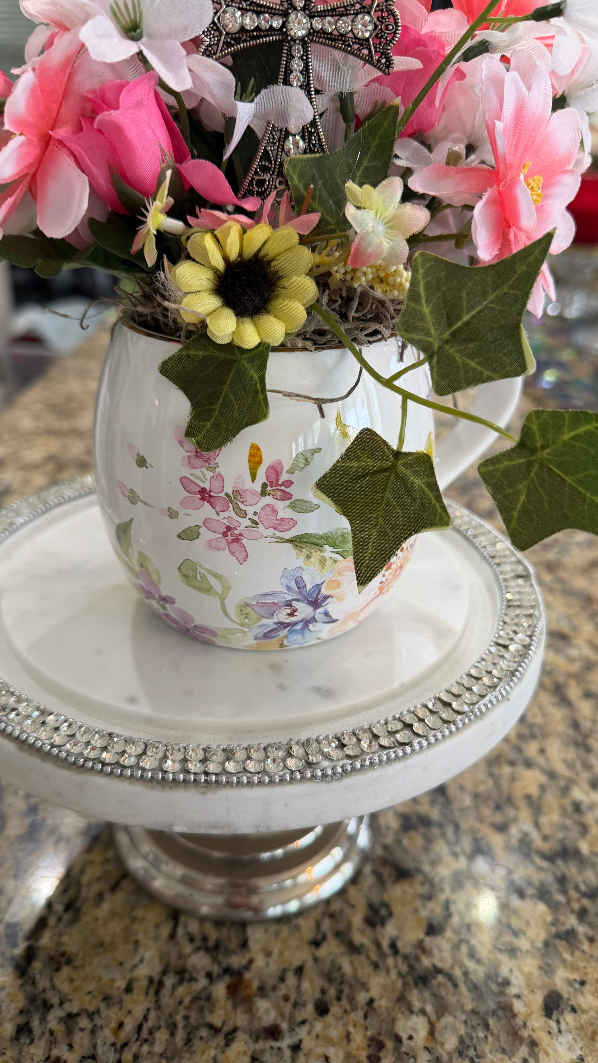 This White Multi-Colored Floral Coffee Cup Adorned w/ Pink & White Flowers Makes a Statement! The Focal Point is a 2 1/2 in by 2 in Silver Rhinestone Cross amidst the Beautiful flowers. At the base of the Cross is a Tiny Yellow Daisy w/ Ivy. Great for Easter, a Birthday, Anniversary. a Retirement or an Encouragement!