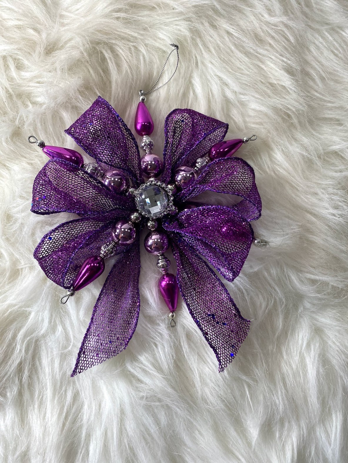 Purple Mesh Bow W/ Hot Pink, Pink & Silver Snowflake & Silver Rhinestone Center